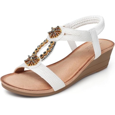 女式坡跟凉鞋花朵低跟正装凉鞋弹性踝带水钻夏季舒适鞋